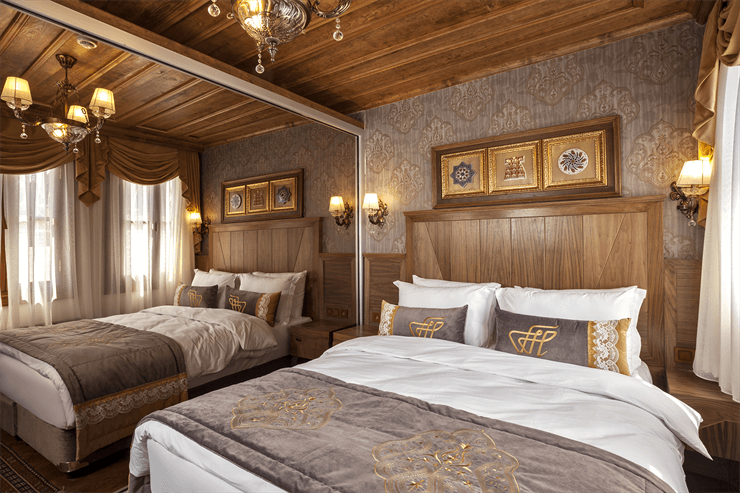 Ekonomik aile odaları camsız, manzarasız ve ortak kullanımlı banyoya sahiptir. Ancak temiz hava girişine sahiptir. Bu odada bir çift kişilik yatak + iki ranza vardır. Bu odada 6 kişi konaklayabilir. Ekonomik aile odası, 25 metrekare büyüklüğünde ve ortak banyolu, bodrum katında yer almaktadır. Tüm Konak odaları, tüm modern olanakların sunulduğu Osmanlı tarzında tasarlanan geçmişin ve günümüzün zarif bir karışımıdır. Uydu televizyon kanalı, 82 inc LCD TV, kablosuz internet bağlantısı, minibar ile donatılmıştır.